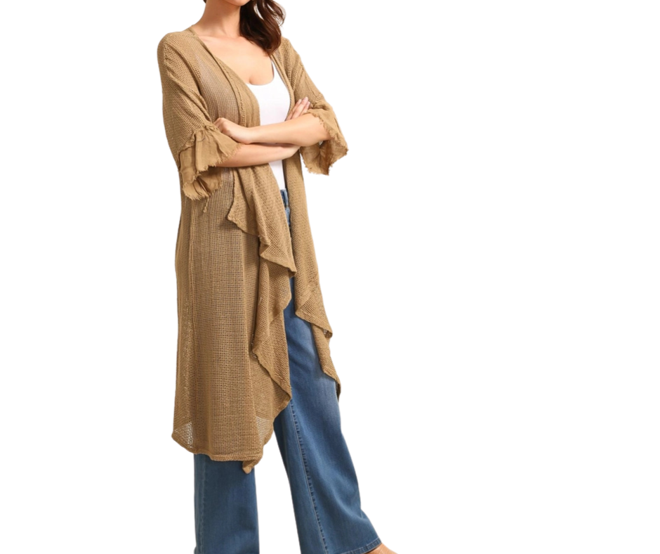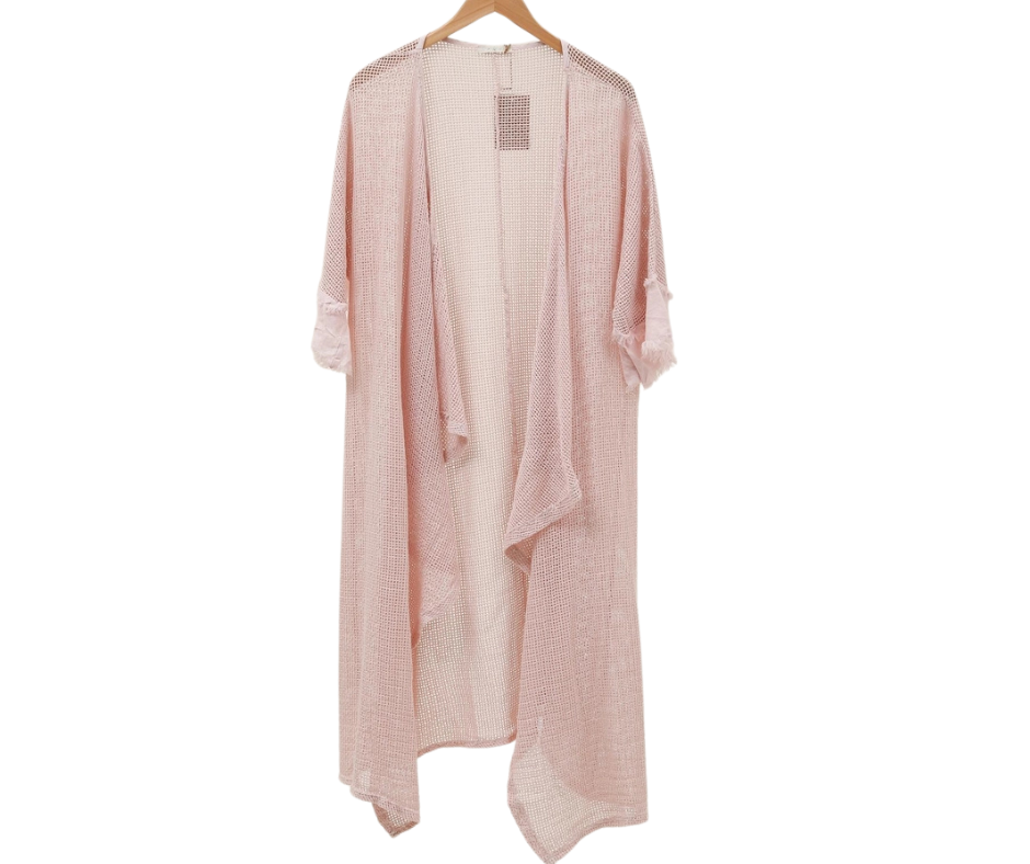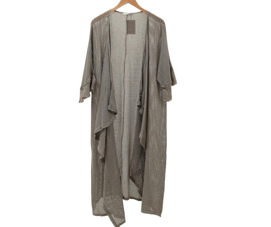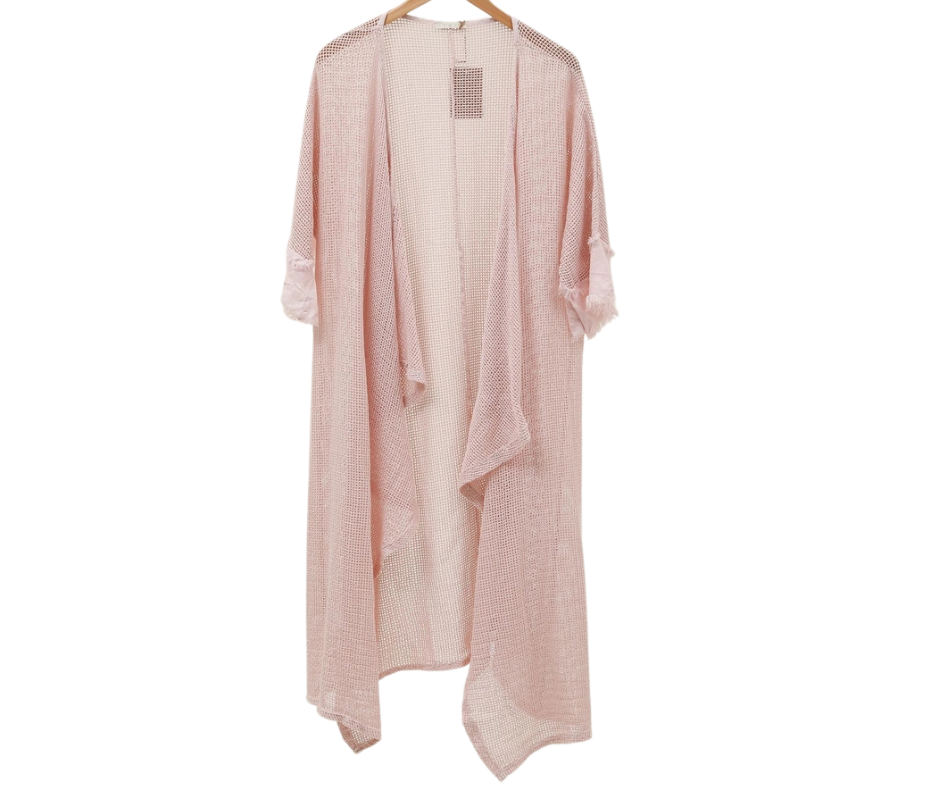 Italian Linen Fishnet Mesh Open Front Kimono Duster with Raw Edge.
