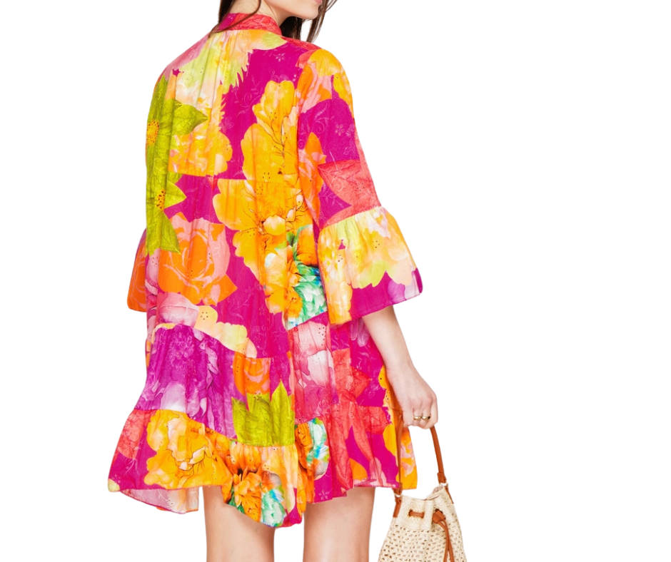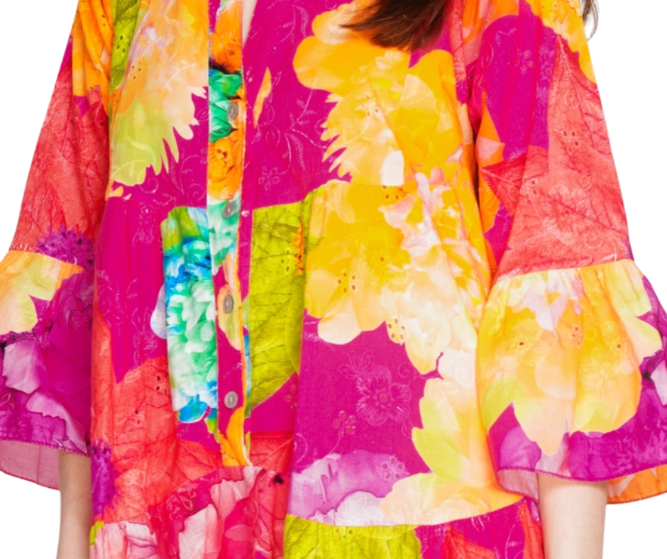 Italian Cotton Embroidered Eyelet Bold Floral Boho Print Babydoll Shirt Dress.